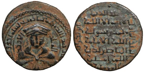 Ayyubids, Al-Awhad Ayyub, Najm al-Din Æ Dirham. Mayyafariqin mint, AH 599 = AD 1202-1203. 8.20 gr. – 26.00 mm. Facing bust wearing cap, two pairs of three straight lines on tied gathered cloak; marginal legend and al-Awhad shown in left field and al-Malik in right / Five-lined Kalima legend in citing titles of Caliph. Album 856.1; ICV -; Whelan 270/1. VF\XF
