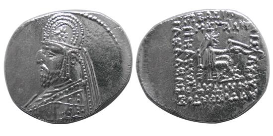 PCW-PA2032-KINGS of PARTHIA. Mithradates III. 87-80 BC. AR Drachm (4.02 gm; 21 mm). Bust left, wearing tiara / Archer (Arsakes I) seated right on throne, holding bow. Sellwood 31.5 var. (Orodes I; legend); Shore 122 var. (Orodes I; same); Sunrise 308. Sharply struck on a broad flan. Complete bust. Excellent metal. Choice FDC. Lightly toned. Fully lustrous.
