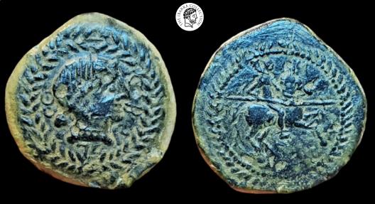 Celt-Iberian, Obulco. Semis. 220-20 BC. Æ. Obv. Head of female right within laurel wreath Rev. Horseman riding right, holding spear. 25mm, 10.69g. ACIP 2182. Earthen dark green-brown patina. EF. Scarce.