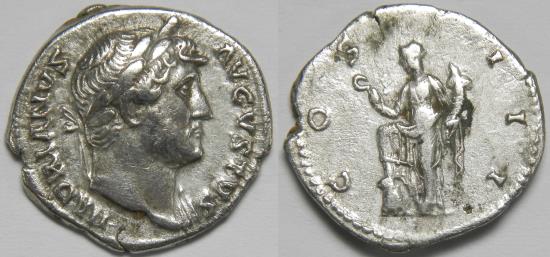 Roman Empire Hadrian AR Denarius (Rome, AD 124-128) HADRIANVS AVGVSTVS, laureate bust right, slight drapery on left shoulder / COS III, Abundantia standing left, foot on modius, holding hook and cornucopiae. 3.20 grams, 19 mm. Very Fine. Small deposit and edge split. RIC 169, RSC 381. Purchased from Numismad, Warsaw. |