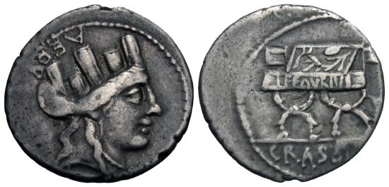 Reverse: Curule chair inscribed P·FOVRIVS; in exergue, CRASSIPES.