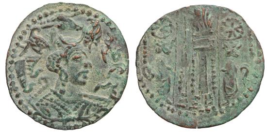 | NEZAK HUNS: 'Nezak Malka', 630-711, AE drachm 3.75g – 26.3 mm. King's bust in profile right with long mustache; wearing a winged crown with a buffalo’s head and a crescent, Pahlavi legend nycky MLK–a // fire altar between two attendants with wheel symbols either side of flames, Type 198, Zeno "a" group, perhaps minted by a local dynasty in the Kabul Valley, excellent strike and attractive patina, Mitch-1510. Rare. XF. The issuers of this type are often referred to as Hunas, Indo-Hepthalites, Turco-Hepthalites, Nezak Huns or sometimes White Huns. "Nezak Malka" the legend on this coin, is probably a title, not the name of a king. The Nezak Malkas were a Turco-Hephthalite dynasty who ruled Kabul, Ghazni and Gandhara as vassals of the Western Turk Yabghu enthroned at Qunduz. In 711, the scion of the junior branch of the Nezak dynasty in Zabulistan unseated his relative, the Nezak Malka at Kabul. In recent years, the dating of these coins has been placed firmly in the 7th century rather than the 6th as previously thought (Göbl, Mitchiner, etc.), thus placing the Nezak "Huns" in the Turkic period rather than the Hephthali |