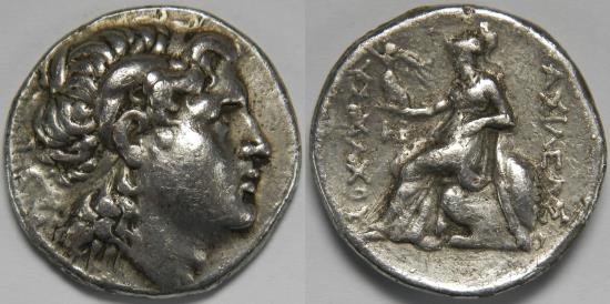 Kingdom of Thrace Lysimachos AR Tetradrachm 306-281 BC Diademed head of the deified Alexander right, with horn of Ammon / BAΣIΛEΩΣ ΛYΣIMAXOY, Athena Nikephoros seated left, left arm resting on shield, transverse spear in background; HP monogram to inner left. Struck in Pella, circa 286-281 BC. 16.24 grams, 27 mm. Very Fine. Slightly corroded. Minor marks. Thompson 247, HGC 3 1750p, Müller 348. Purchased from Sol Numismatik. |