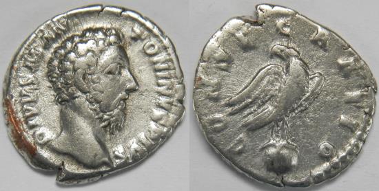 Roman Empire Divus Marcus Aurelius AR Denarius (Rome, AD 180) Bare head right / CONSECRATIO, eagle standing right on globe, head left, wings spread. Consecration issue, struck under Commodus. 3.36 grams, 18 mm. Very Fine. Tiny edge splits. Some discoloration on the obverse's edge. RIC 273 (Commodus), RSC 91. Purchased from HD Rauch, Vienna. |