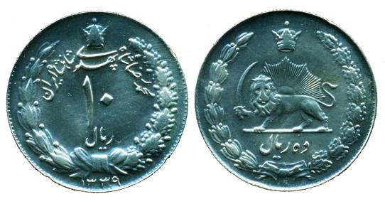IRAN, PAHLAVI: 1960 large copper-Nickle 10 Rials SH 1339