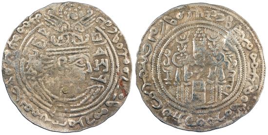 AR Drachm 3.28g. 33mm. Uncertain mint in Baktria Crowned Sasanian-style bust r.; Brahmi inner legend ('his perfection, Candana, Lord of the Oxus'); Baktrian legend in outer margin ('his perfection, the lord, Commander Sandan, king, the lord'); tamgha countermark and gold plug below bust. Fire altar flanked by attendants; star and crescent flanking flames; Pahlavi inner legend ('increase,' 'from glory'); Baktrian legend in outer margin citing the Baktrian Khagan (supreme leader). Vondrovec 244; c/m: Göbl, Dokumente KM 103 Toned. Some porosity. This type features three languages - Baktrian, Brahmi, and Pahlavi - which pinpoints its issuance to Baktria.