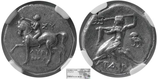 PCW-G7503-CALABRIA, Taras. Circa 280-240 BC. AR Didrachm. NGC-Choice VF. Youth on horseback left, crowning horse with wreath, "EY" to right, inscription below horse; Reverse: Taras astride dolphin holding a trident above head, owl to right in field. Vlasto-834. NGC-Choice VF. Certificate 4935324-194. Well centered. Lightly toned.
