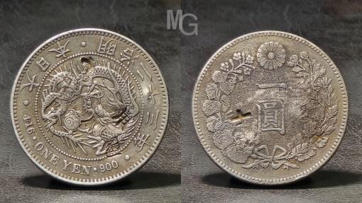 Japan AR Silver, one yen year 23 (1890) with several countermarks.