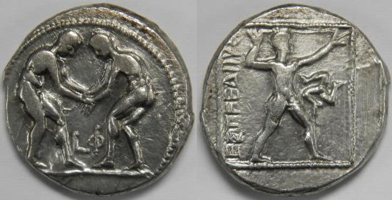 Pamphylia Aspendos AR Stater circa 380/375-330/325 BC Two wrestlers grappling, LΦ between / Slinger in throwing stance right; to right, triskeles to left. 10.96 grams, 21 mm. Good Very Fine. Light scratches. Tekin Series 4, SNG France 105, BMC 35, SNG von Aulock 4565, SNG Copenhagen 227. Purchased from Solidus Numismatik, München. |