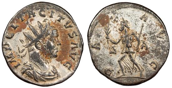 AE Antoninianus 4.15g. 22mm. 275-276 A.D. Lugdunum Mint Radiate, draped and cuirassed bust, r. IMP C L TACITVS AVG Pax walking l., holding branch and sceptre; (delta)-A across fields. PAX AVG RIC V 38 Rare. Nearly fully silvered in fields with dark patina on high points. Some reddish adhesions. Seemingly very rare control marks for this variety with Pax walking; listed as 'common' in RIC but much rarer on the market today.