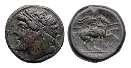 SICILY, Syracuse. Hieron II. 275-215 BC. Æ (27 mm, 18.21 grams). Struck circa 230-218/5 BC. Diademed head left; bow and quiver to right / Horseman riding right, holding couched spear in right arm; NI below. Dark brown-green patina with patches of red. Condition: Nice VF, with large and heavy flan. Ex. Large specialist collection of Syracusan bronzes of Dr. Hans Maag, ex. Busso Peus auctions. |