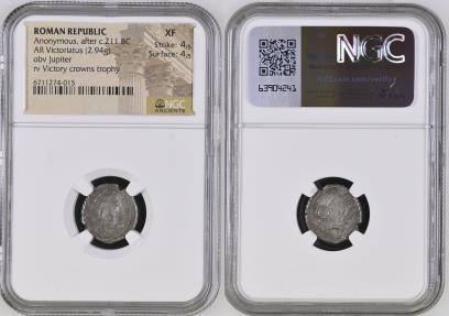 Anonymous. 211-208 BC. AR Victoriatus (15mm, 2.94 g, 7h). Uncertain Campanian mints. Laureate head of Jupiter right, hair falling in three neat ringlets; all within bead and reel border / Victory standing right, crowning trophy, ROMA in exergue. Crawford 97/1b; Sydenham 121; RSC 36e*; RBW 395. In NGC encapsulation XF 4/5 - 4/5