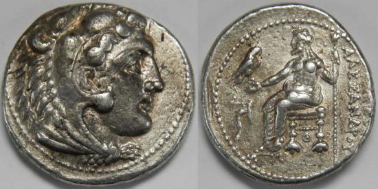 Kingdom of Macedon Alexander III (the Great) AR Tetradrachm 336-323 BC Head of Herakles right, wearing lion skin / Zeus Aëtophoros seated left; upright plow in left field, Θ below throne. Lifetime issue. Struck in circa 327-323 BC, Tarsos. 17.23 grams, 27 mm. About Extremely Fine. Lovely toned. Minor marks. Price 3032. Comes with a photo certificate from Numismatik Naumann, Vienna. Video: https://youtu.be/9r6fT6Eo8KM |