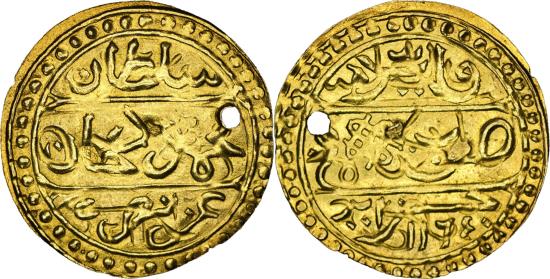Ottoman Empire. Mahmud I (1143-1168h / 1730-1754), Gold ¼ Sultani (0.66g/ 20mm). Algeria, (Jezayir) AH 1164. Pierced at 2 O’clock, otherwise very fine. Extremely RARE.