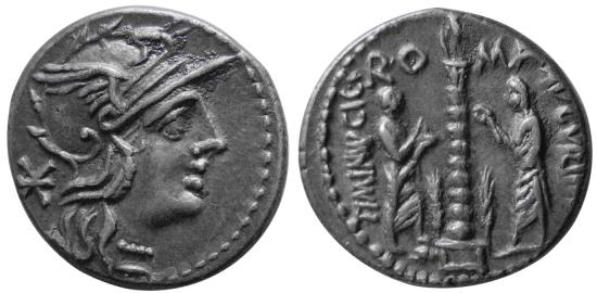 PCW-R5355-ROMAN REPUBLIC, TI. Minucius C.F. Augurinus. 134 BC. AR Denarius (3.91 gm; 19 mm). Rome. Obv: Helmeted head of Roma right; mark of value to left. Rev: ROMA / TI MINVCI C F / AVGVRINI. Ionic column surmounted by statue; at base, two stalks of grain; to the left, L. Minucius Augurinus standing right, holding patera, foot on modius; to the right, M. Minucius Faesus standing left, holding lituus. Crawford 243/1; Sydenham 494; RSC Minucius 9. Choice Superb EF. Nice old cabinet toning. |