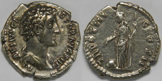 Roman Empire Marcus Aurelius as Caesar AR Denarius (Rome, AD 148-149) Bare head right / Providentia standing left leaning on column, holding scepter in her left hand and pointing to globe with her right. 3.37 grams, 18 mm. About Extremely Fine. Tiny edge splits. RIC 446 (Antoninus Pius), RSC 628. Purchased from Rex Numismatics, Rotterdam. |