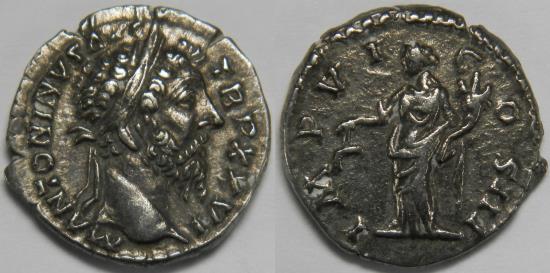 Roman Empire Marcus Aurelius AR Denarius (Rome, AD 172-173) Laureate head right / Aequitas standing left, holding scales and cornucopia. 3.49 grams, 18 mm. About Extremely Fine. Dark tone. Some deposits. RIC 252, RSC 257. Purchased from Rex Numismatics, Rotterdam. |