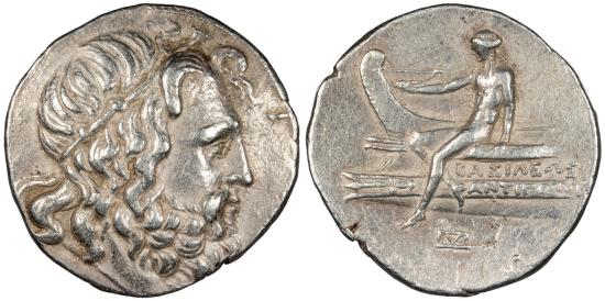 AR Tetradrachm 17.07g. 31mm. Amphipolis or Pella mint Head of Poseidon r,, wearing wreath of marine plants. Apollo, testing bow in extended r. hand, seated l. on prow, l., inscribed BASILEWS ANTIGONOU; monogram below. HGC 3, 1051 (Doson); SNG Alpha Bank 1046-7 (Doson) Lightly toned with some lustre in devices. Bold and well struck. Lightly brushed with faint hairlines in fields. Small scratch on reverse. Formerly attributed to Antigonos III Doson, but more recent hoard evidence reveals a stronger link to Antigonos II Gonatas or his successor, Demetrios II.