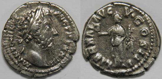 Roman Empire Marcus Aurelius AR Denarius (Rome, AD 169) M ANTONINVS AVG TR P XXIII, laureate head right / LIBERAL AVG V COS III, Liberalitas standing left, holding abacus and cornucopiae. 3.16 grams, 19 mm. Good Very Fine. Light tone. Edge splits. RIC 206, RSC 412. Purchased from Savoca Numismatik, München. |