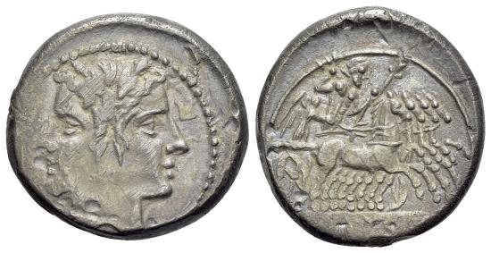 Roman Republican. Anonymous. Circa 225-214 BC. AR Didrachm – Quadrigatus (20.5mm, 4.96g, 9h). Uncertain mint. Laureate head of Janus; [•] below neck R/ Jupiter, hurling thunderbolt and holding scepter, in galloping quadriga right driven by Victory; ROMA, partly incuse and partly raised, on tablet below. Crawford 31/1; Sydenham 64c; RSC 23a; cf. RBW 80 (for obv. style–narrow head) and 81 (for pellet below neck). VF Pierluigi Debernardi and Steve Brinkman in "A New Arrangement for RRC 53/2", Revue Numismatique 2018, suggest that the dot symbol is connected with the Cornelii Lentuli. This identification is supported by a fourfold match between coinage and moneyers: (1) Lilybaeum, Sicily 214-212 BC, P. Cornelius Lentulus praetor: quadrigatus (RRC 31 – this coin type); (2) Bovianum 212, Cn. Cornelius Lentulus quaestor: denarius (RRC 44/5) with/without dot; (3) Sardinia 211 BC, L. Cornelius Lentulus praetor: denarius and quinarius with dot (RRC 66); (4) Apulia 210-209 BC, L. Cornelius Lentulus legatus of Marcellus pro-cos: XX gold asses with dot. Mark Passehl suggested this brilliant association to the authors, the dot or pellet being a lentil, in Latin lens or lenticulae, a punning symbol for the Lentuli. This symbol is found not only on the several series mentioned in the above paper, but also on the Sardinian series RRC 66, which comprises not only the quinarius described in RRC, but also a denarius (http://stevebrinkman.ancients.info/anonymous/#H66-2). [Andrew McCabe] |
