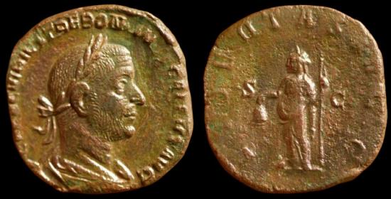 Trebonianus Gallus (251-253), Sestertius, Rome, AD 251-253, AE (16.8g 30mm), IMP CAES C VIBIVS TREBONIANVS GALLVS AVG, laureate, draped and cuirassed bust r., Rv. LIBERTAS AVGG, Libertas standing l., holding pileus and sceptre in field, S - C. RIC 114a C 64 |