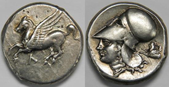 Akarnania Leukas AR Stater circa 320-280 BC Pegasos flying left; Λ below / Helmeted head of Athena left; to right, forepart of griffin left. 8.61 grams, 19 mm. About Extremely Fine. Tiny deposits and die rust on obverse, pale die break on reverse. Pegasi 117, BCD Akarnania 266, HGC 4 825. Purchased from InAsta S.P.A., San Marino. Video: https://youtu.be/Q9LqEDzYbZY |