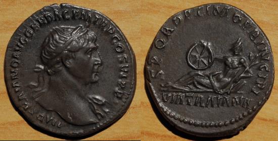 IMP TRAIANO AVG GER DAC P M TR P COS VI P P, laureate and draped bust right / S P Q R OPTIMO PRINCIPI, personification of via Traiana reclining left on rocks, with wheel and branch; VIA TRAIANA in exergue.