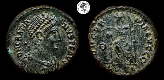 | Gratian. AE Follis. Antioch mint. 367-383 AD. Nice portrait, green patina. VF. |