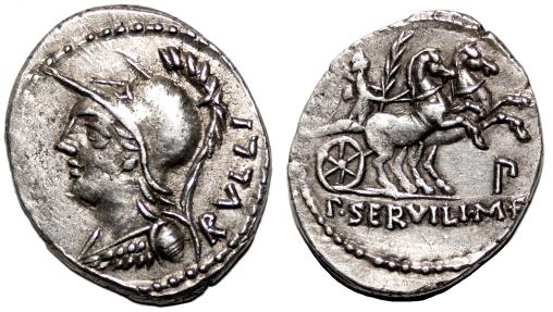 Obverse: Helmeted bust of Minerva left; behind, RVLLI. Reverse: Victory, holding palm-branch, in prancing biga right; below, P. In exergue, P·SERVILI·M·F.