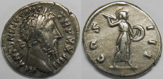 Roman Empire Marcus Aurelius AR Denarius (Rome, AD 169-170) Laureate head right / Minerva, helmeted, standing right, brandishing javelin in right hand and holding round shield on left arm. 3.03 grams, 19 mm. Good Very Fine. RIC 211, RSC 123. Purchased from Savoca Numismatik, München. |