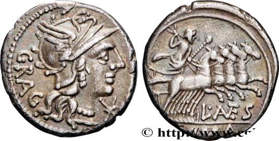 Reverse : ROMA à lexergue ; L. (ANTE)S en monogramme sous le quadrige Jupiter dans un quadrige galopant à droite, tenant un sceptre long et les rênes de la main gauche et brandissant un foudre de la main droite