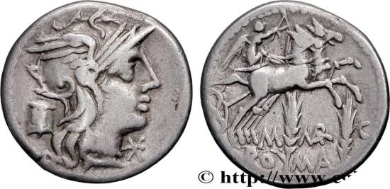 Reverse : M-(MAR)-C// RO-MA Victoire dans un bige galopant à droite, tenant une couronne et les rênes ; sous les chevaux, deux épis de blé