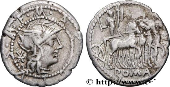 Obverse : M. ACILIVS. M. F. sur le bord extérieur Tête casquée de Rome à droite ; derrière, marque de valeur (XVI) en monogramme ; le tout sur un bouclier