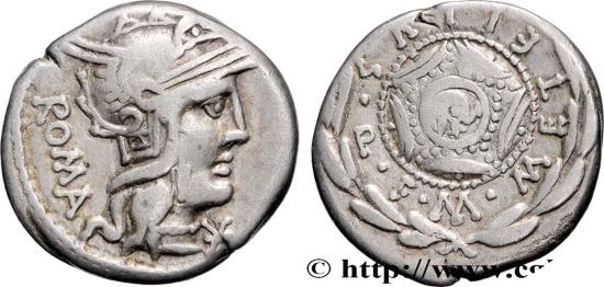 Reverse : M. METELLVS. Q. F. Bouclier macédonien dans une couronne de laurier, orné en son centre d’une tête d’éléphant