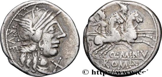 MINUTIA Denier 122 AC. Rome silver Obverse : RVF Tête de Rome à droite, coiffée du casque ailé ; sous le menton, X Reverse : ROMA ; Q. MINV à l’exergue Les Dioscures, Castor et Pollux (les Gémeaux) à cheval, galopant à droite, nus avec le manteau flottant sur lépaule, coiffés dun bonnet surmonté dune étoile, tenant chacun une javeline Pedigree : Exemplaire provenant de la collection P. L Commentary : Monnaie centrée. Joli portrait. Usure régulière. Patine grise