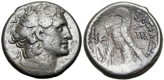 PTOLEMAIC KINGS OF EGYPT. Kleopatra VII Thea Neotera, 44-30 BC. Tetradrachm (Silver, 23 mm, 13.79 g, 12 h), Alexandria, Dated regnal year ΙΘ (19) = 33-32 BC. Diademed head of Ptolemy I(?) to right, wearing aegis. Rev. ΠΤΟΛΕΜΑΙΟΥ ΒΑΣΙΛΕΩΣ eagle standing to left on thunderbolt with palm frond over shoulder; to left, L ΙΘ; to right, ΠΑ. DCA 70. SNG Copenhagen 415. Svoronos 1833. Toned. Light earthen deposits, otherwise, good very fine. |