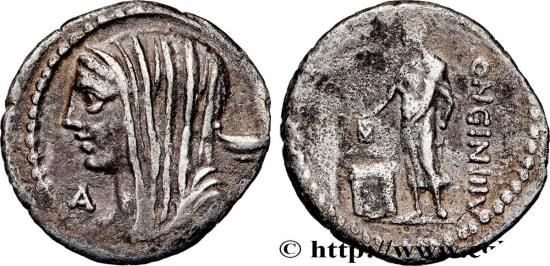 Obverse : Anépigraphe Tête voilée de Vesta à gauche ; derrière, la kylix ou le cymbium (coupe à deux anses à boire) et devant, marque de contrôle A