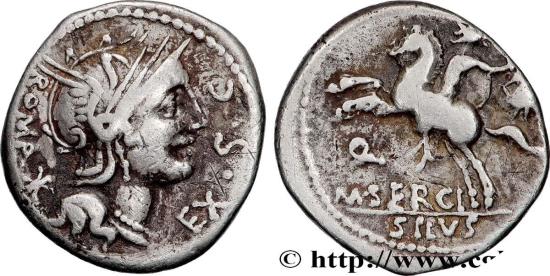 Reverse : Q/ M. SERGI// SILVS Cavalier casqué bondissant à gauche, brandissant une épée et tenant de la main gauche une tête coupée et de la main droite, un bouclier