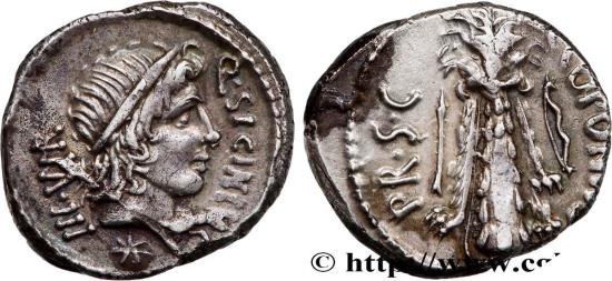 Obverse : Q. SICINIVS - III. VIR Tête diadémée d’Apollon à droite ; en dessous une étoile