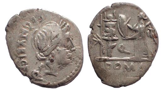 C. Egnatuleius C.f. 97 BC. AR Quinarius 18 mm. 1.9 gm. Rome mint. Obv: Laureate head of Apollo; Q (mark of value) below. Rev: Victory standing left, inscribing shield attached to trophy; Q between. Crawford 333/1; King 36; Sydenham 588; Egnatuleia 1.