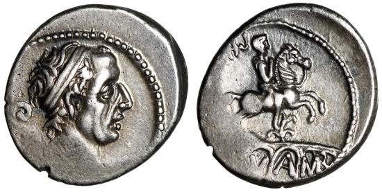 L. MARCIUS PHILIPPUS AR DENARIUS Rome Mint 56 BC Obverse: Head of King Ancus Marcius right, lituus behind, ANCVS below Reverse: Equestrian statue of Q. Marcius Rex above the aqueduct, Aqua Marcia, flower below horse, AQVA MAR (MAR in monogram) within the arches of the aqueduct, PHILIPPVS on left References: Crawford 425, Sydenham 919 Size: 18mm, 3.95g Professional Numismatic Notes: Good very-fine with a lovely old-collection tone! An area of flat strike