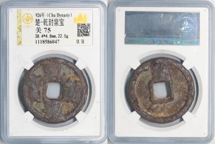 | China. Chu Dynasty. Qian Feng, 925-951, iron 10 cash (22.5g), H-15.63, qian feng quán bao, with ce above on reverse, graded 75 by GBCA Grading. According to the histories, because there was much lead and iron in Hunan, Ma Yin took the advice of his minister Gao Yu to cast lead and iron coins at Changsha in 925. One of these was worth ten copper cash, and their circulation was confined to Changsha. Merchants traded in these coins to the benefit of the State. |