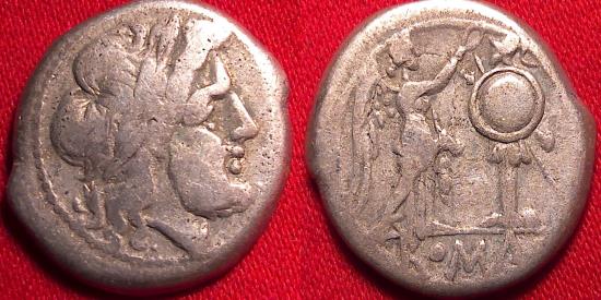 ANONYMOUS AR silver victoriatus. Rome, 208 BC or later. 3.0 grams! Victory erecting trophy, Bust of Jupiter