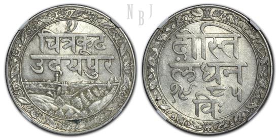 Mewar (British Protectorate), Fatteh Singh, VS 1985 (1928) Silver Rupee. Obv: Inscription in Nagari: Chitrakoot / Udaipur. Rev: Inscription in Nagari: Dosthi Londhon (“Friendship with London”).