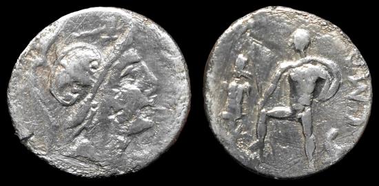 Obv: Helmeted head of Mars r.. Rev: Warrior standing l. before trophy, foot on cuirass, prow and C MAL behind.. Cr-335/3b, Syd-615, RSC Poblicia-6a |