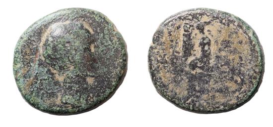| Bithynia, Nicaea. Julius Caesar. Ae, 23 mm. 7.7 gm. struck in the name of the governor of Bithynia et Pontus, the proconsul C. Vibius Pansa Caetronianus, Dated year ϚΛΣ (236) = 47/6 BC. Obv: [ΝΙΚΑΙΕΩΝ] Bare head of Julius Caesar to right. Rev: [ΕΠΙ ΓΑΙΟΥ ΟΥΙΒΙΟΥ ΠΑΝΣΑ, ϚΛΣ] Nike advancing to right, holding wreath in her right hand and palm in her left; to right and below left, monogram. BMC 8-9. RG 11. RPC 2026. Rare. VIDEO |