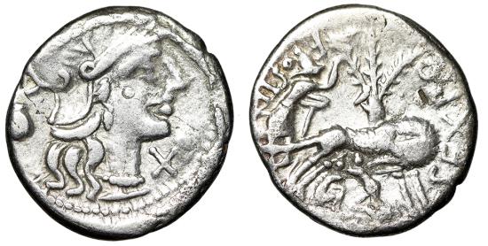 Sex. Pompeius Fostlus AR Denarius Rome Mint 137 BC Obverse: Helmeted head of Roma right; capis to left, X below chin Reverse: She-wolf suckling Romulus and Remus before fig tree with birds in its branches, the shepherd Faustulus to the left side References: Crawford 235/1c; Sydenham 461a; Pompeia 1a; RBW 972 Size: 20mm, 3.57g Professional Numismatic Notes: Very-fine!