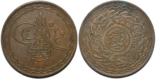 Obverse Toughra, with the letter ain (in isolate letter form) in the loops at left, legends and AH date 1332 below