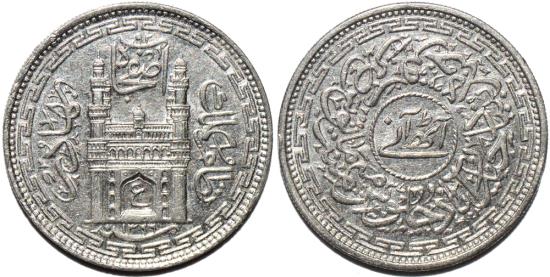 The first (and only) NICKEL 8-anna piece, in which the central circle on the reverse has a legend, not the numeral for the denomination. The second series of Mir Usman Ali Khan was introduced in AH 1361 with the denomination featured prominently in the center of the reverse, but that was replaced by the legend when the nickel (rather than silver) coinage was introduced. Note the fine detail on this SUPERB specimen of a SCARCE type! |