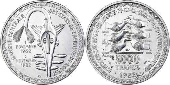 | | West African States, 5000 Francs, 1982, Silver, , KM:11 | | | Gold weight in the shape of a fish, Taku, a symbol of prosperity, Six interlaced birds symbolizing states | | FEATURES |